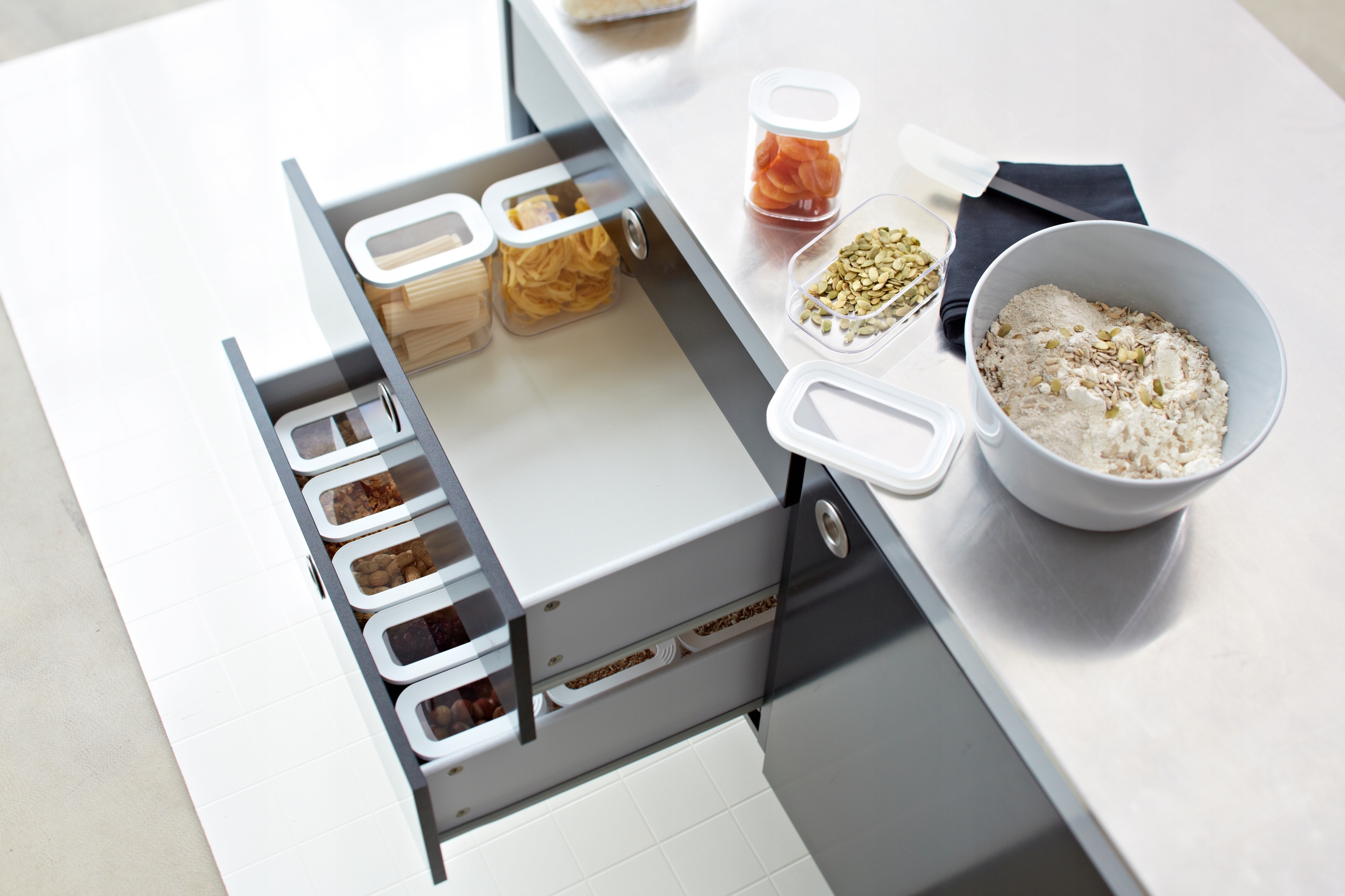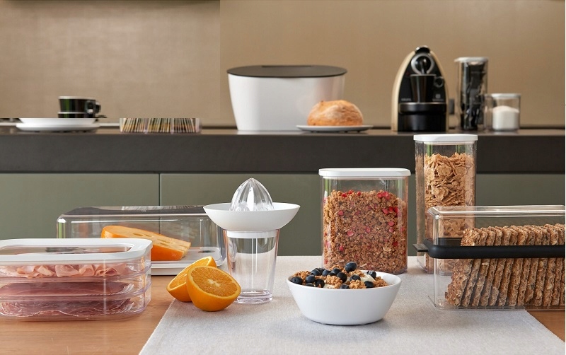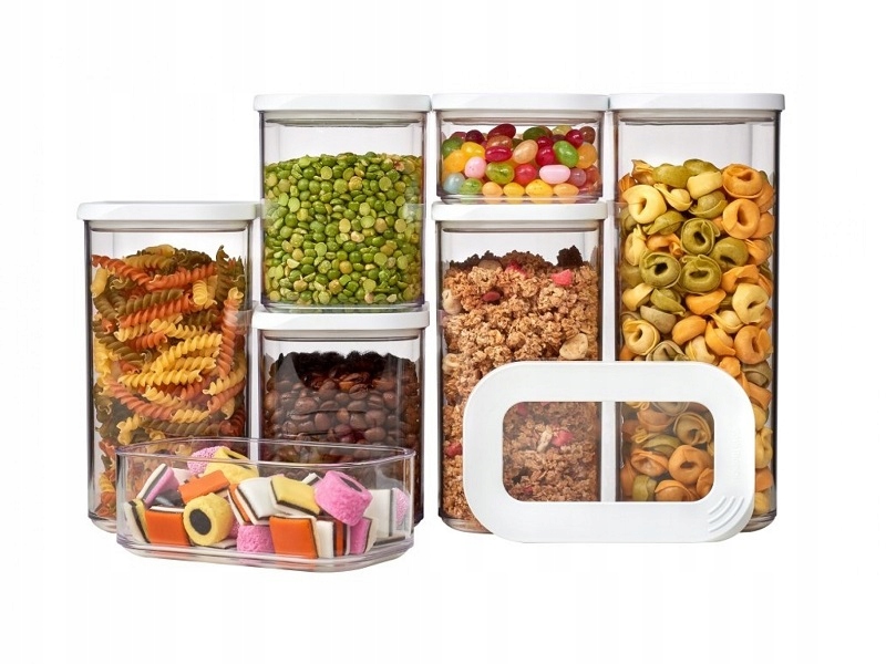 - Możliwość piętrowego ułożenia pojemników pomaga zaoszczędzić i lepiej zagospodarować miejsce w lodówce lub szafce kuchennej.